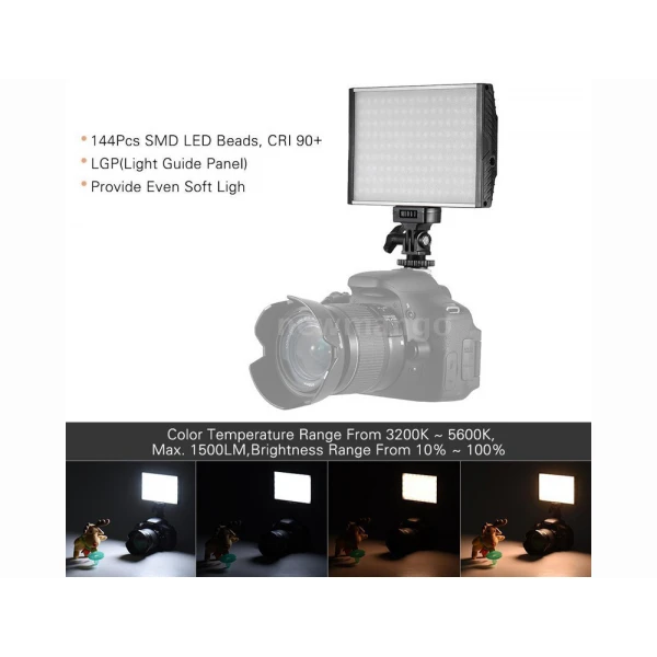 Επαγγελματικών προδιαγραφών πανίσχυρο φωτογραφικό - βίντεο led στα 1500 Lumens (144 SMD LED), με χρωματικό φάσμα από τα 3200 kelvin έως τα 5600 kelvin με εξαιρετικούς δείκτες CRI 95+ εξασφαλίζοντας άριστη χρωματική πιστότητα. . Πρόκειται για ένα φορητό, on camera φωτιστικό σώμα 15w θερμού + 15w ψυχρού φωτισμού, εξαιρετικής ποιότητας. Μεταλλική κατασκευή, ιδιαίτερα ελαφριά και λεπτή, προσφέρει ιδανικές συνθήκες φωτισμού τόσο σε ένταση όσο και σε ποιότητα. Λειτουργεί με μπαταρία τύπου NP Sony ή και με ρεύμα. Δεν συμπεριλαμβάνονται
